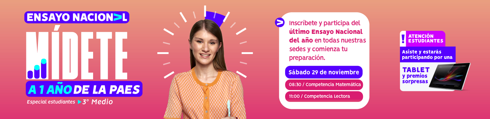 Ensayos nacionales cuyo objetivo es diagnosticar tus habilidades y autoevaluarte para la nueva prueba de Acceso a la Educación Superior (PAES). Te invitamos a participar del Ensayo Nacional PAES MÍDETE.